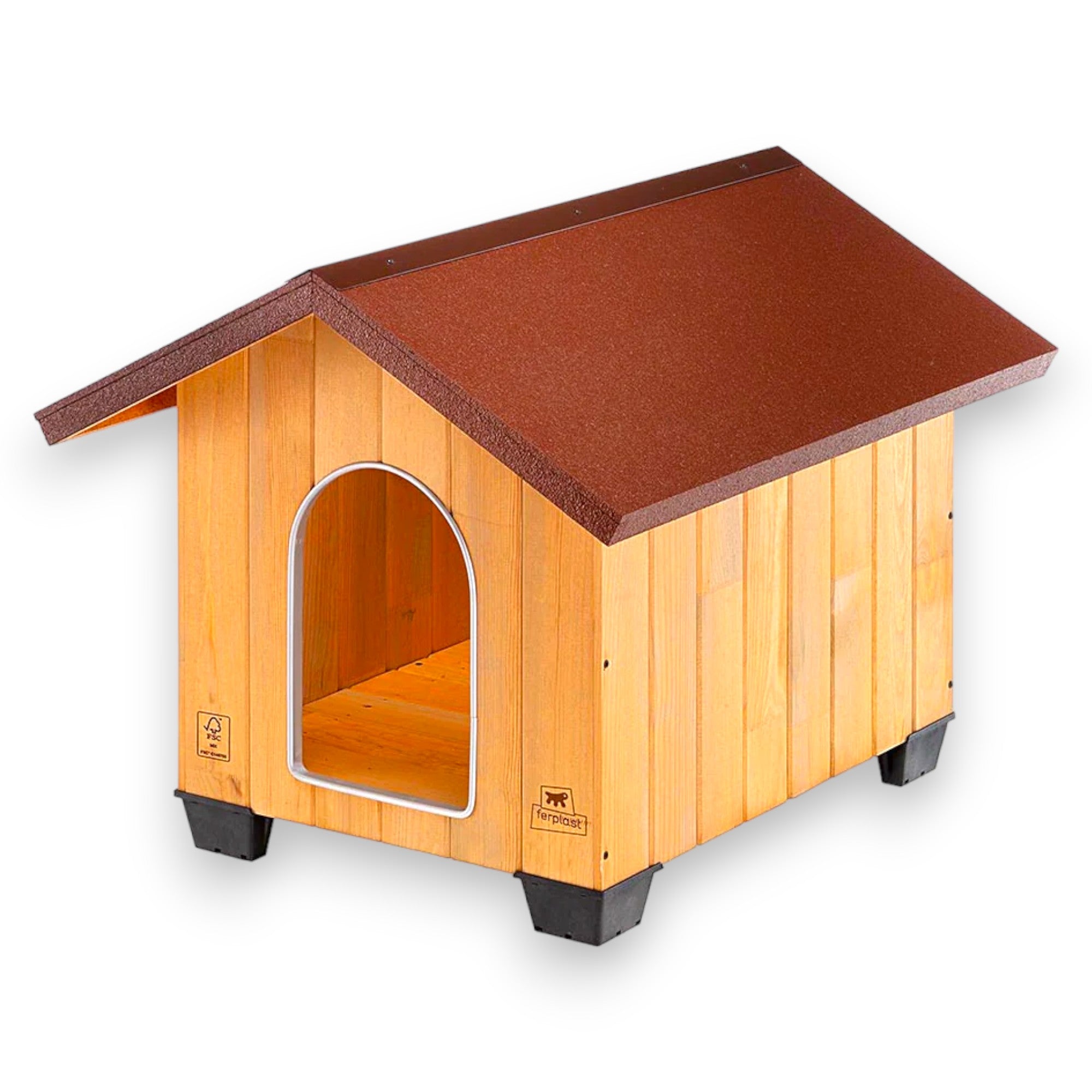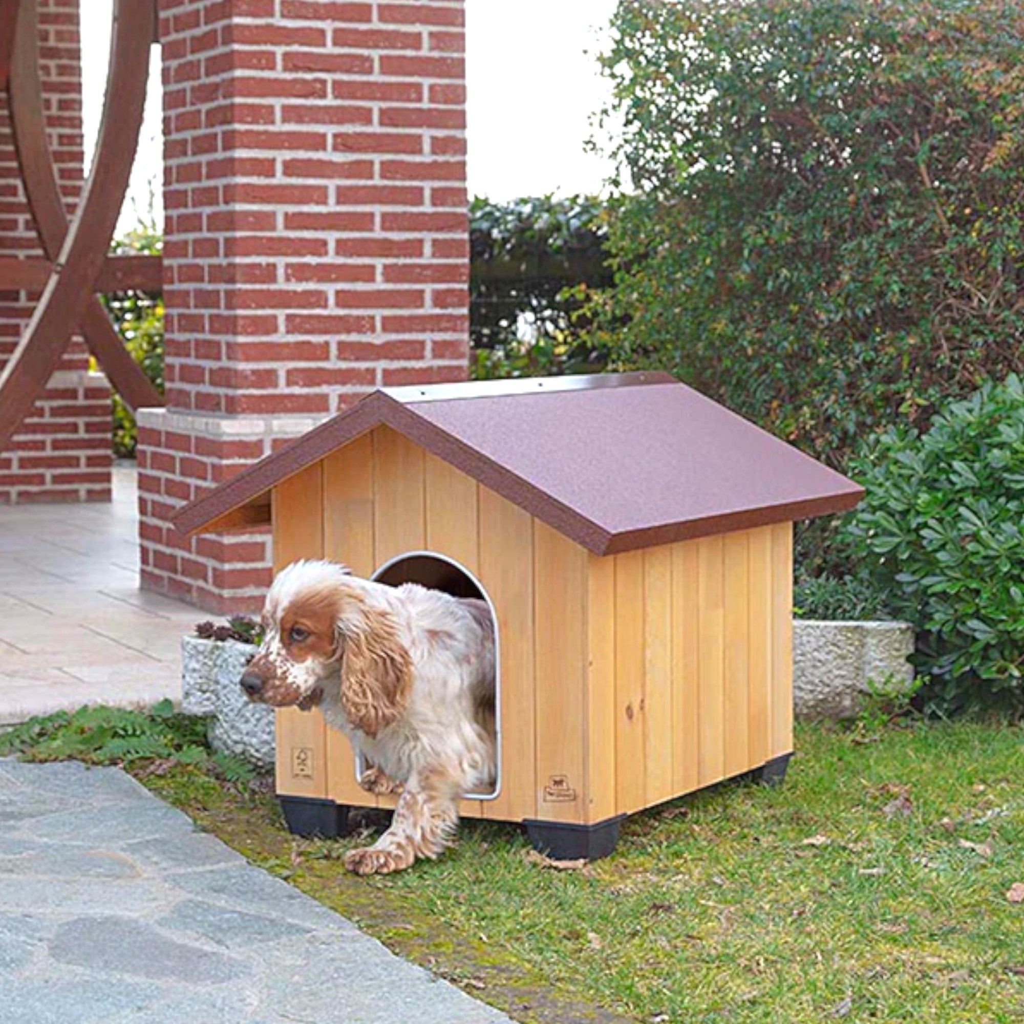 Cuccia rialzata in legno di pino per cani di taglia media con tetto spiovente imperme...