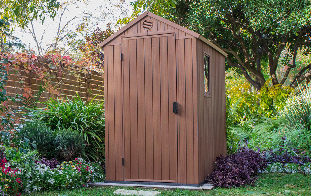 Casetta cottage da giardino porta attrezzi in resina effetto legno Cortina Marrone