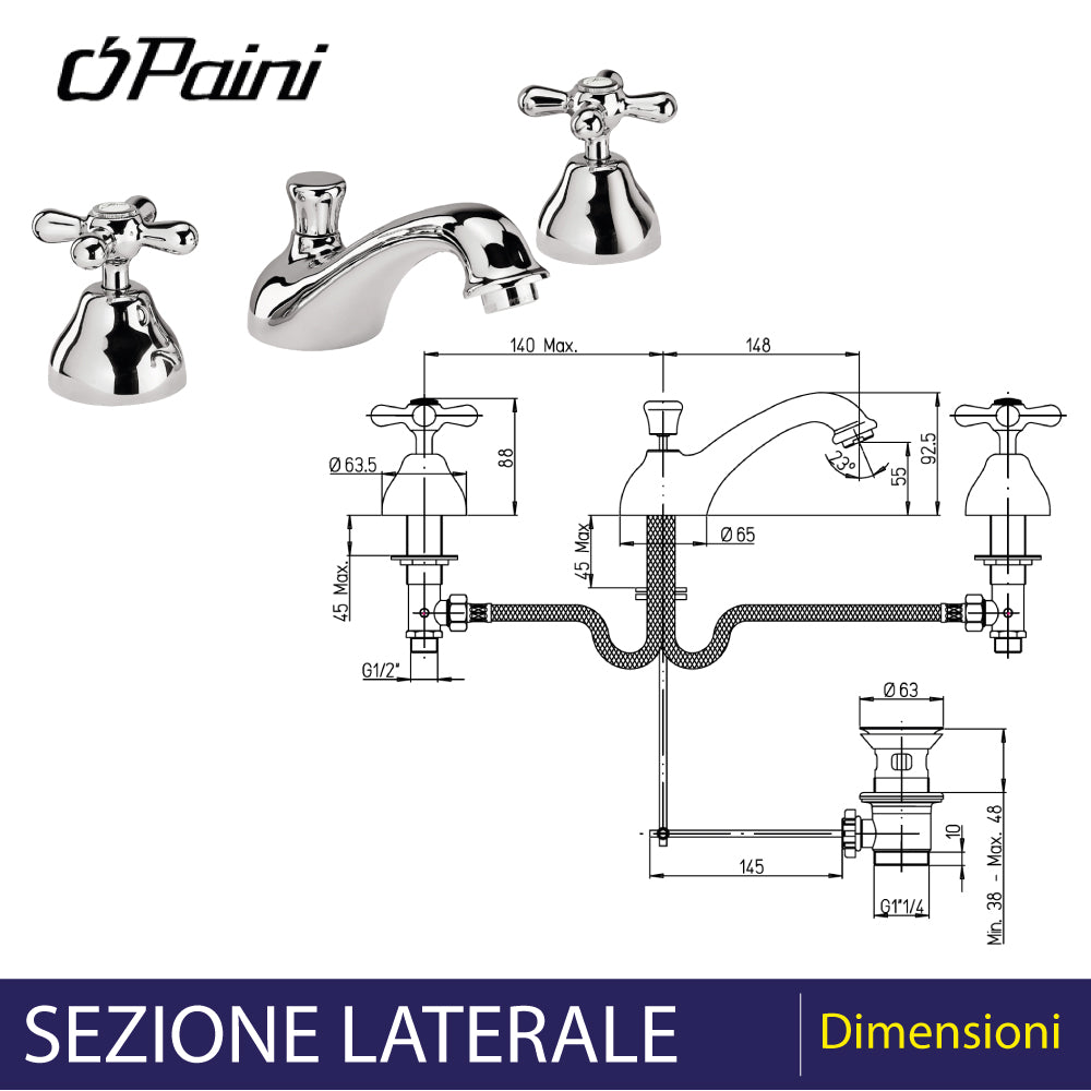 Batteria lavabo a tre fori cromata con piletta di scarico automatico 1"1/4 Liberty