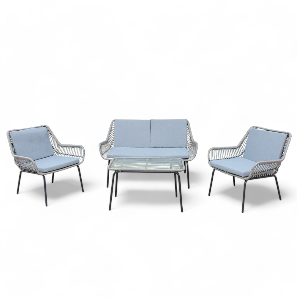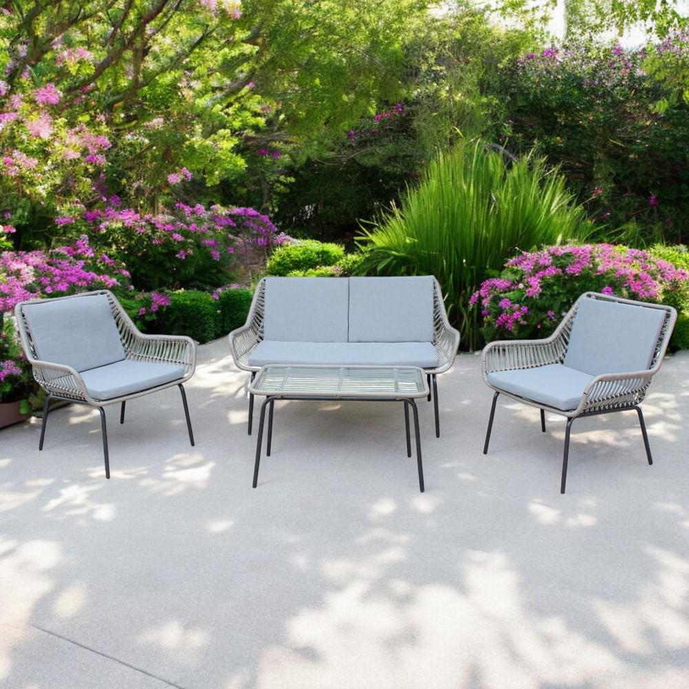 Salotto da esterno giardino 4 posti con struttura in acciaio rivestito in corda di po...