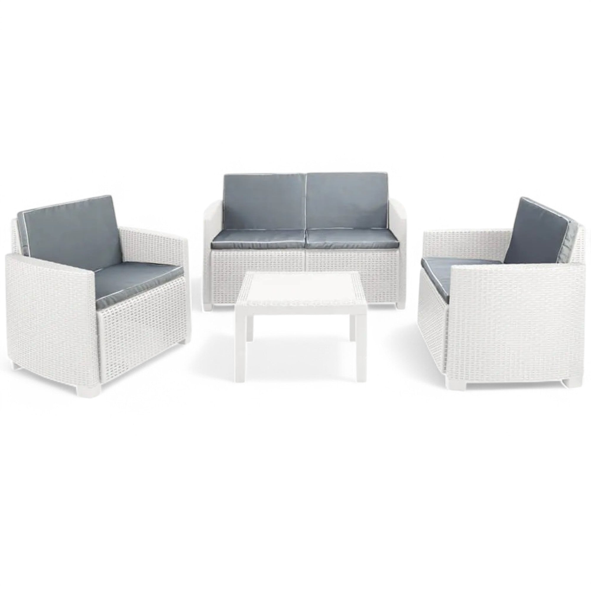 Salotto da giardino in resina effetto rattan divano da due posti con due poltrone e u...