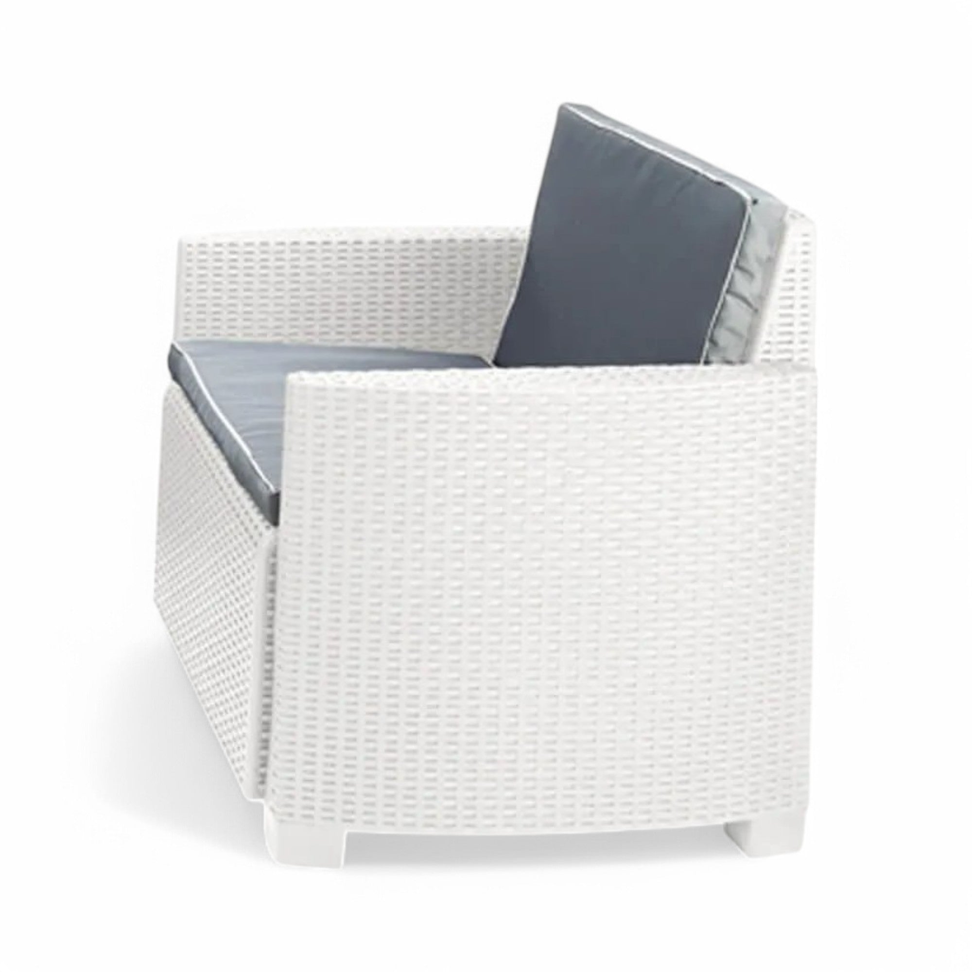Salotto per esterno in polietilene rattan bianco 2 poltrone 1 divano biposto con cusc...