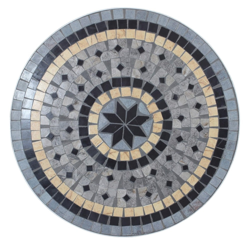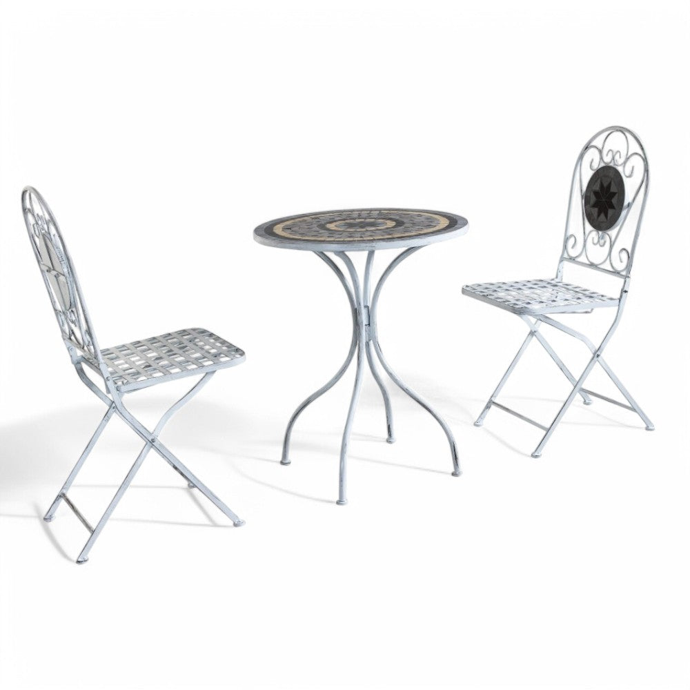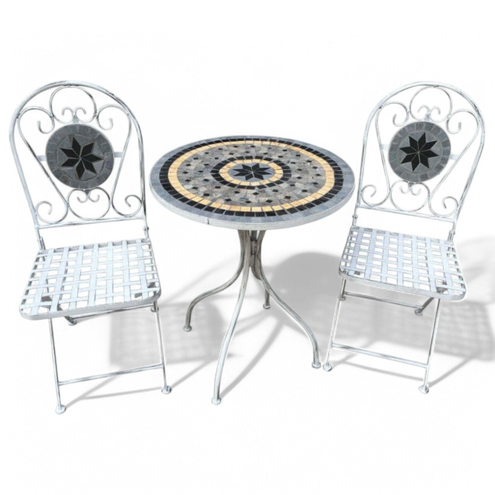 Set bristò 1 tavolo e 2 sedie in acciaio marmo con decorazioni mosaico bianco e grigi...