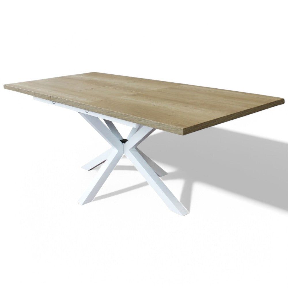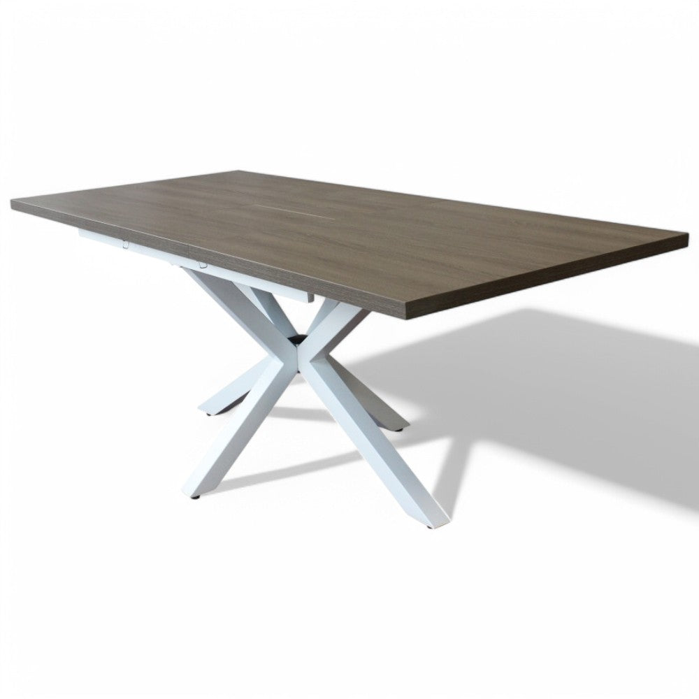 Tavolo allungabile struttura in metallo bianco e marrone con piano in melamina venatu...