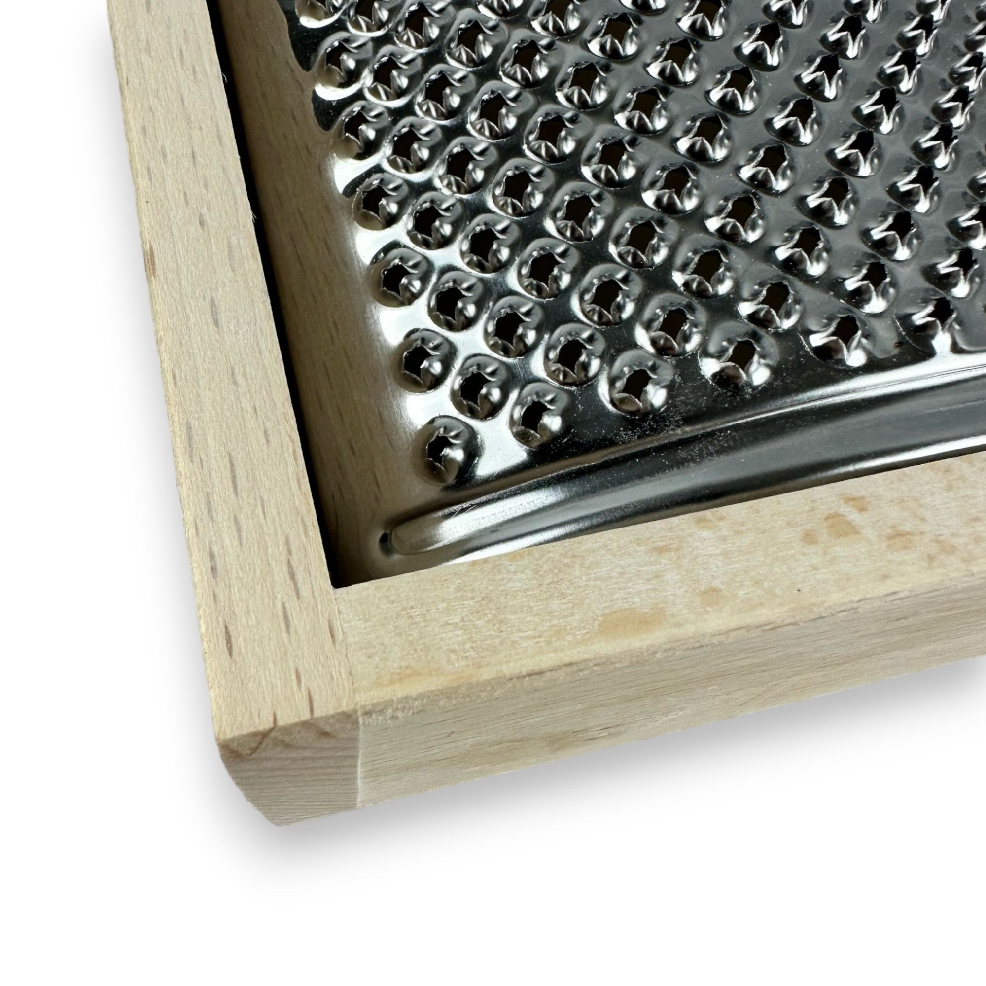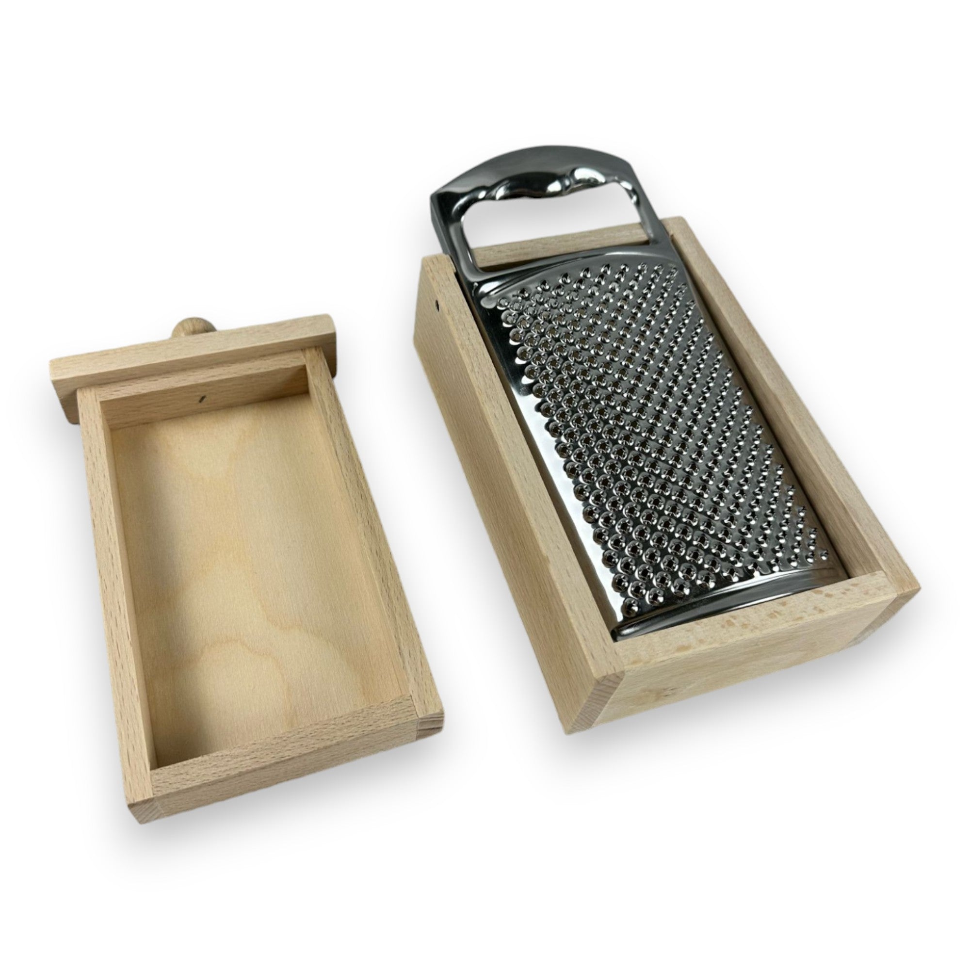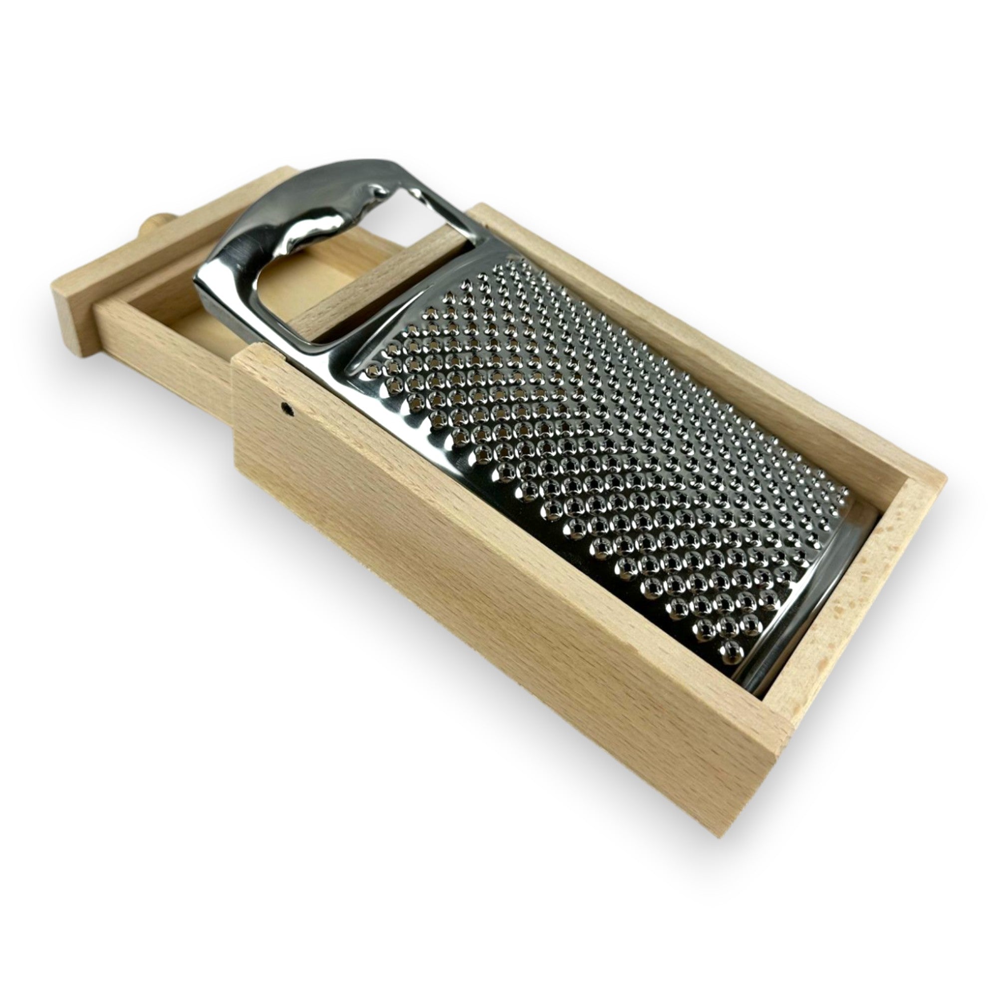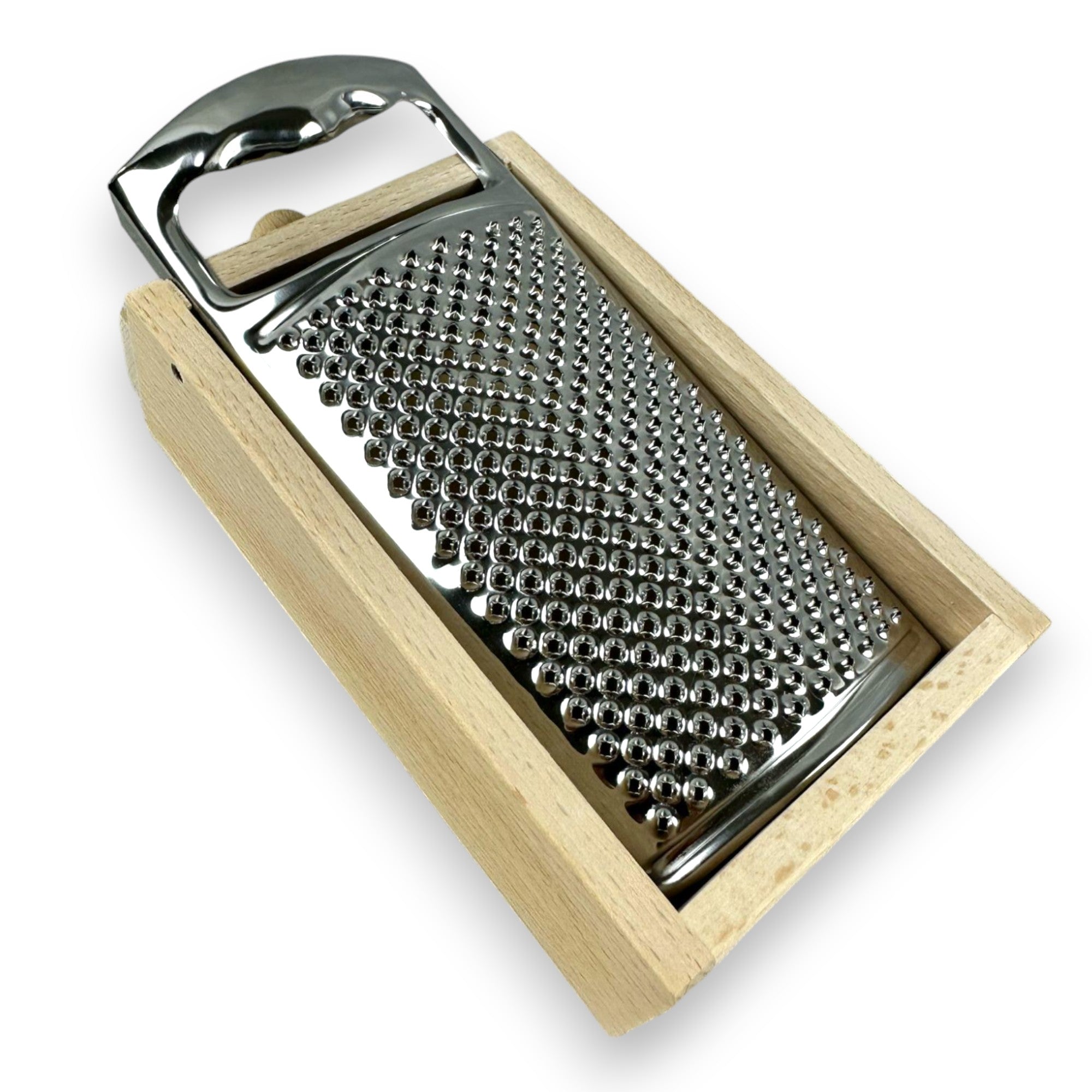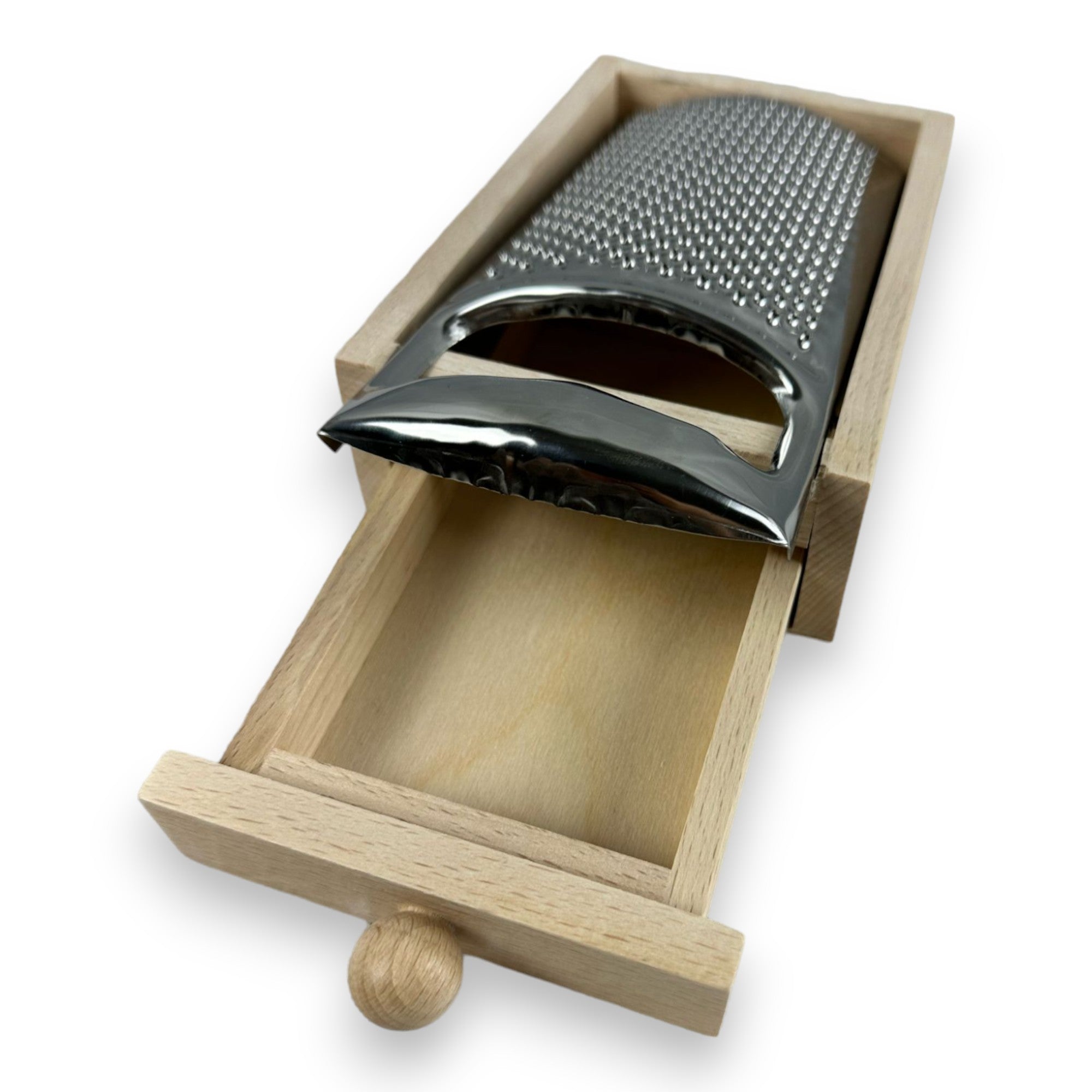 Grattugia in acciaio inox con impugnatura e cassetto raccoglitore in legno