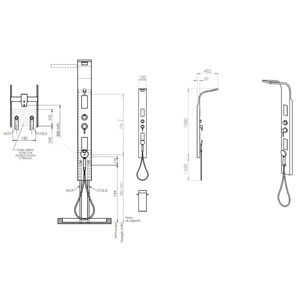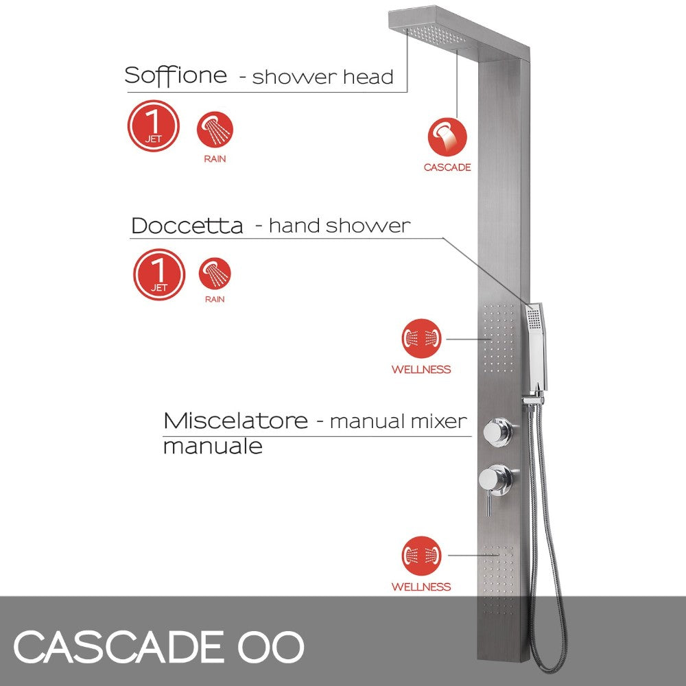 Pannello doccia in acciaio inox h155 cm con getto a cascata e deviatore acqua a 4 vie...