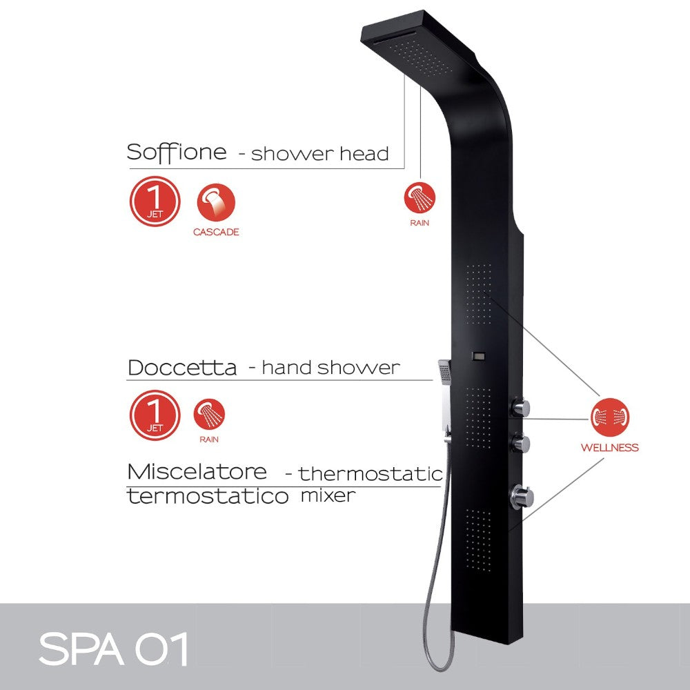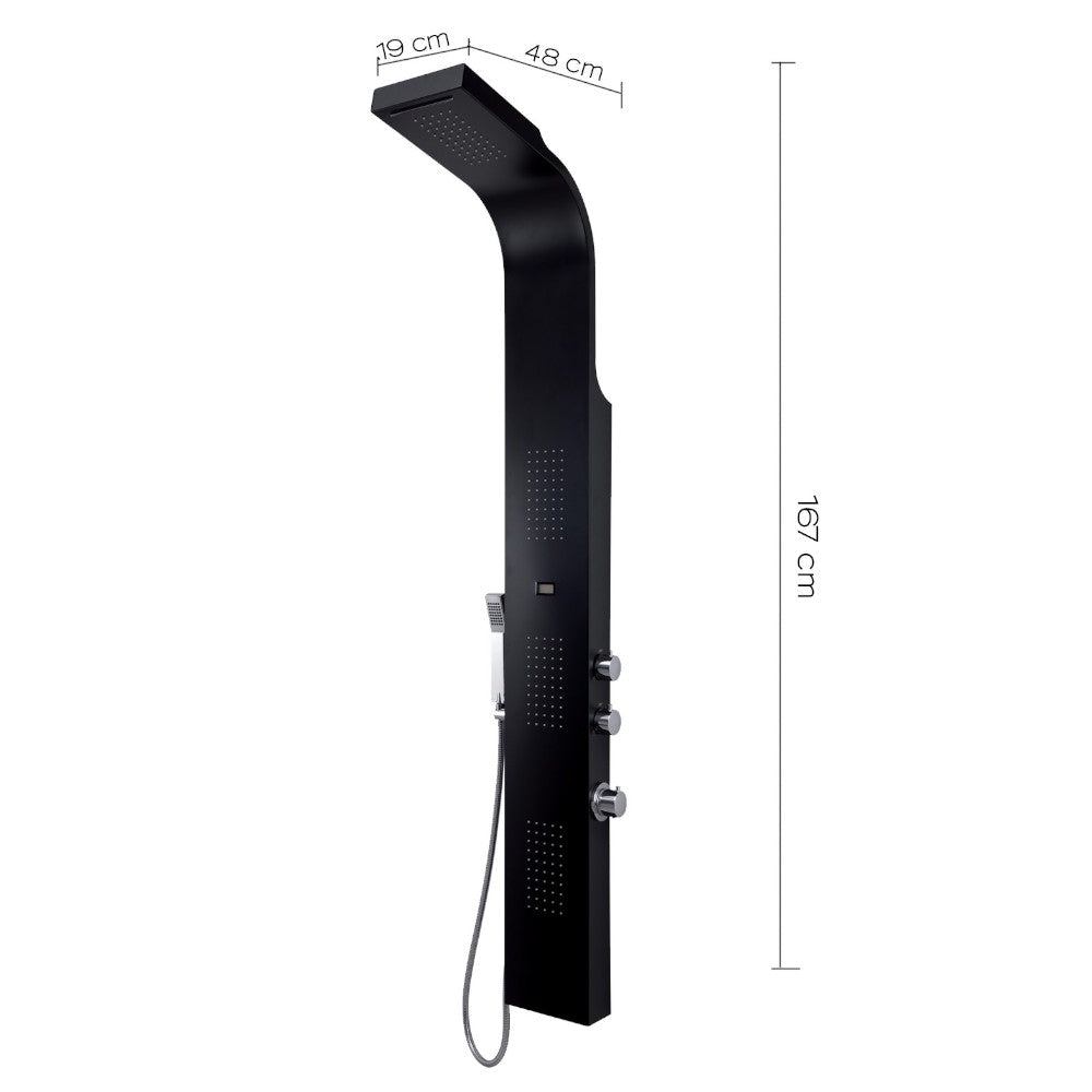 Pannello doccia multifunzione in acciaio inox nero h166 cm con getto a cascata e misc...