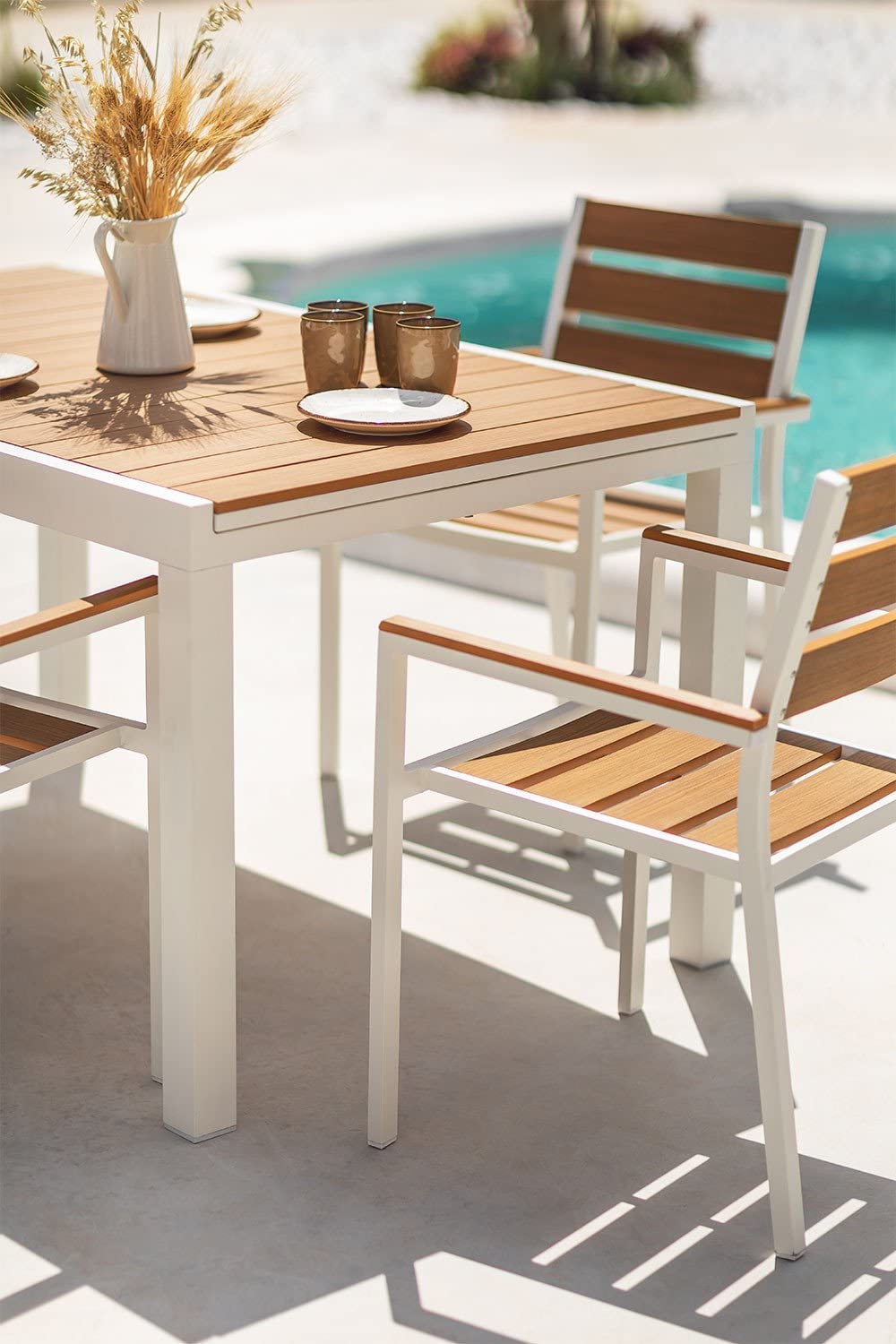 Una comoda sedia con braccioli realizzata con una struttura in alluminio robusta e resistente rinforzata con una barra sotto la seduta, unita a finiture in polietilene simil legno, conferiscono un tocco naturale ed elegante al design.